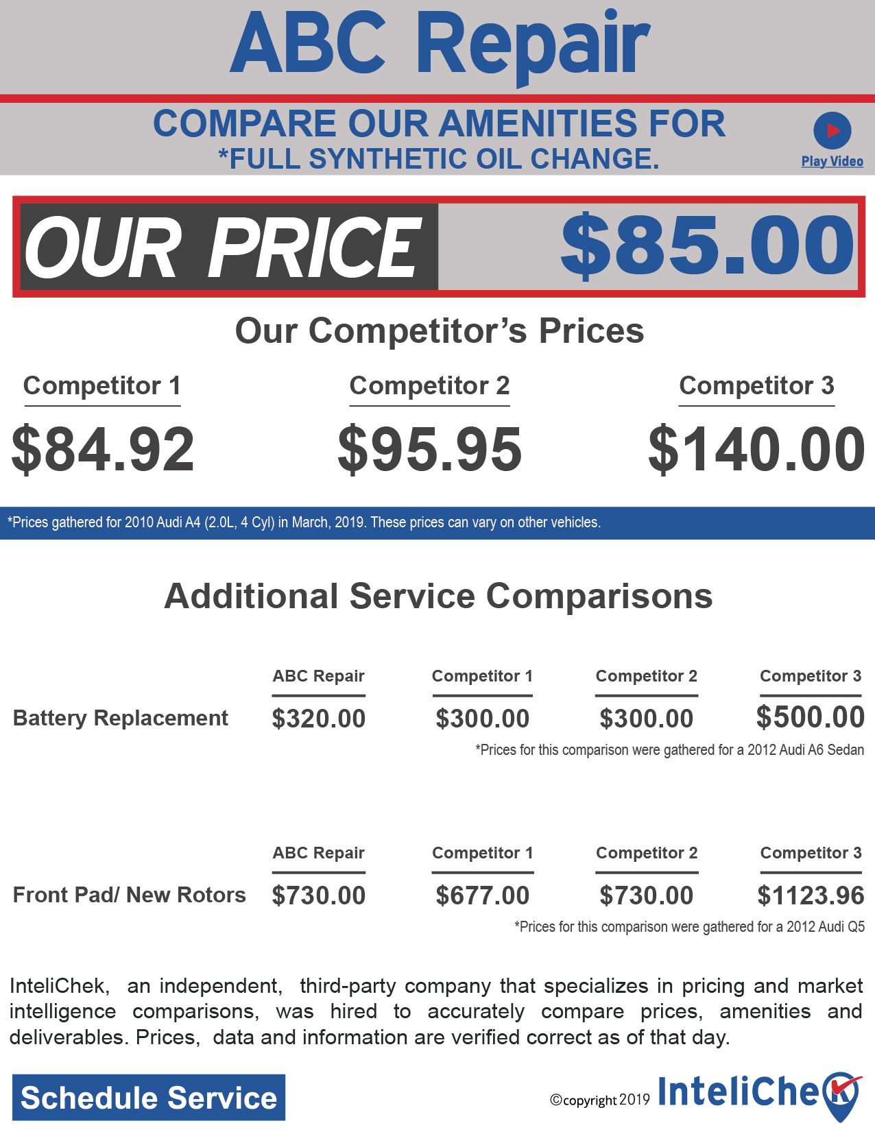Once you complete the initial setup process, any changes you make to your widget from our Advertising Creator will automatically update your widget every time you want to promote a different service. Your widgets are completely customizable. You can change your price at anytime, as well as choose whether you'd like to list the competitor's name, or list them as a "Local Competitor".