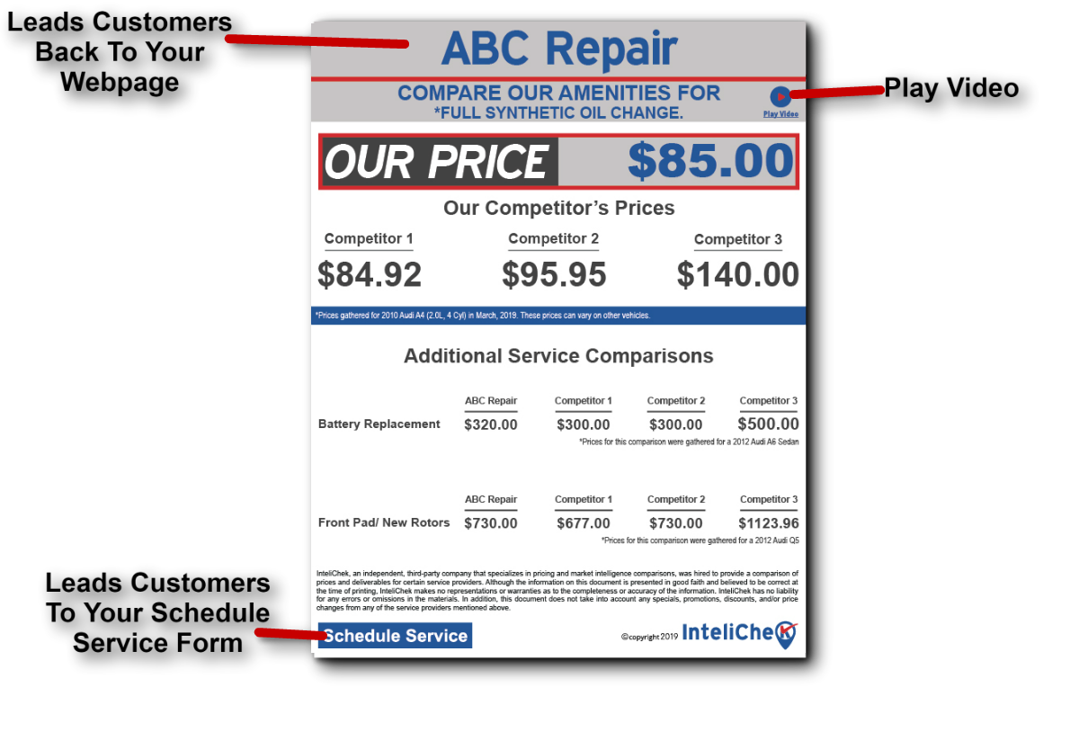 Each widget has a print option, where your consumers can print the competitive price comparison directly from the widget. We will work with your web master to make the personalization and transfer, from our system to yours, seamless. InteliChek can create these in either a pop-up window or as an image placed directly on your homepage. Show off what you do best!